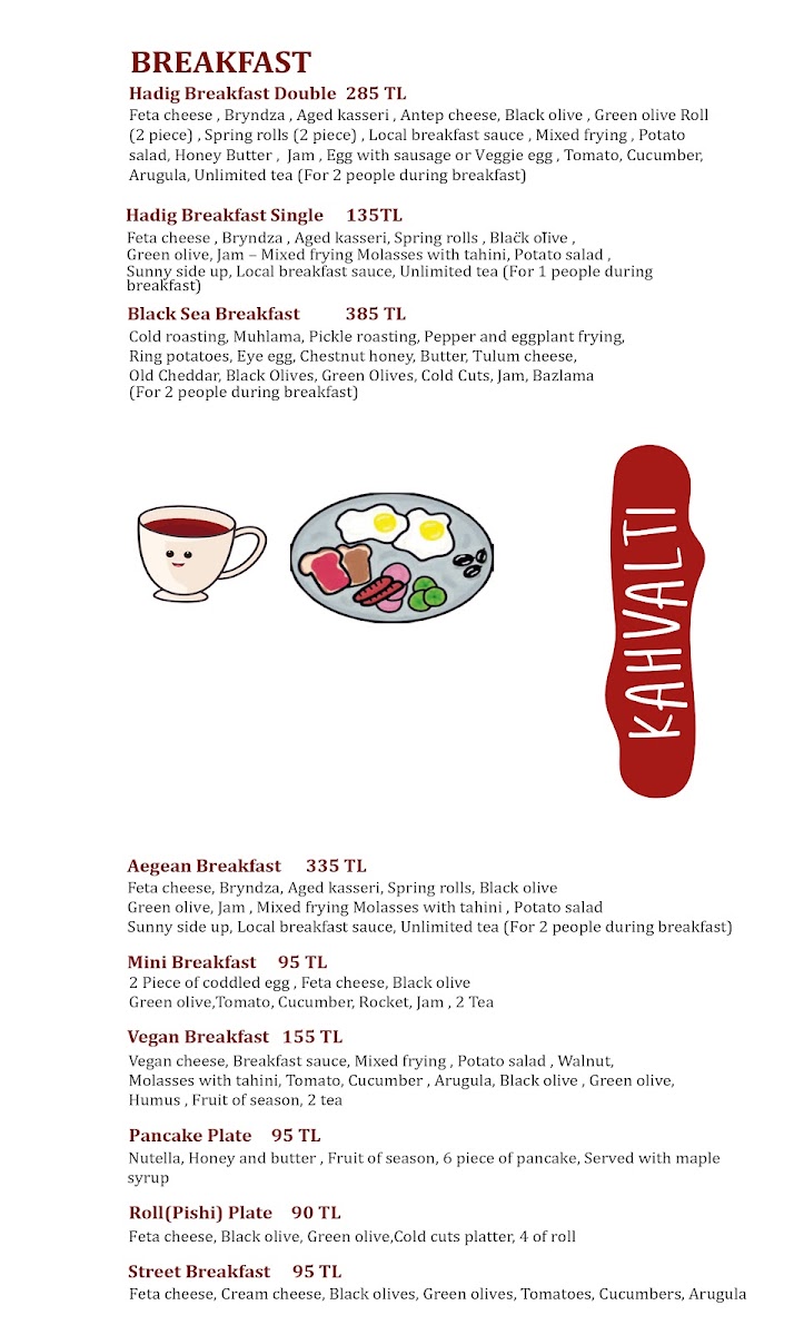 Beyaz peynir, Tulum peyniri, Eski kaşar, Sigara böreği, Siyah zeytin, Yeşil zeytin, Söğüş tabağı, Tahin pekmez, Reçel, Karışık kızartma, Küp patates kızartma, Tek göz yumurta, Köy acukası, Sınırsız çay